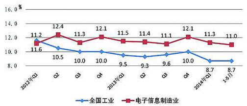 2014年1-5月,我國(guó)電子信息產(chǎn)業(yè)增速出現(xiàn)小幅回落,主要指標(biāo)增速仍低于去年同期和去年年底水平。當(dāng)前,我國(guó)產(chǎn)業(yè)發(fā)展面臨的國(guó)內(nèi)外環(huán)境日趨復(fù)雜。國(guó)際方面,美國(guó)經(jīng)濟(jì)發(fā)展緩慢,新興經(jīng)濟(jì)體也出現(xiàn)資本外流,經(jīng)濟(jì)下行壓力較大,對(duì)我國(guó)出口產(chǎn)生不利影響。國(guó)內(nèi)方面,房地產(chǎn)市場(chǎng)出現(xiàn)明顯降溫,市場(chǎng)觀望情緒日益濃厚,投資增速大幅下滑。但隨著本輪我國(guó)采取“微刺激”政策作用的逐步顯現(xiàn),將會(huì)提升經(jīng)濟(jì)內(nèi)在活力。