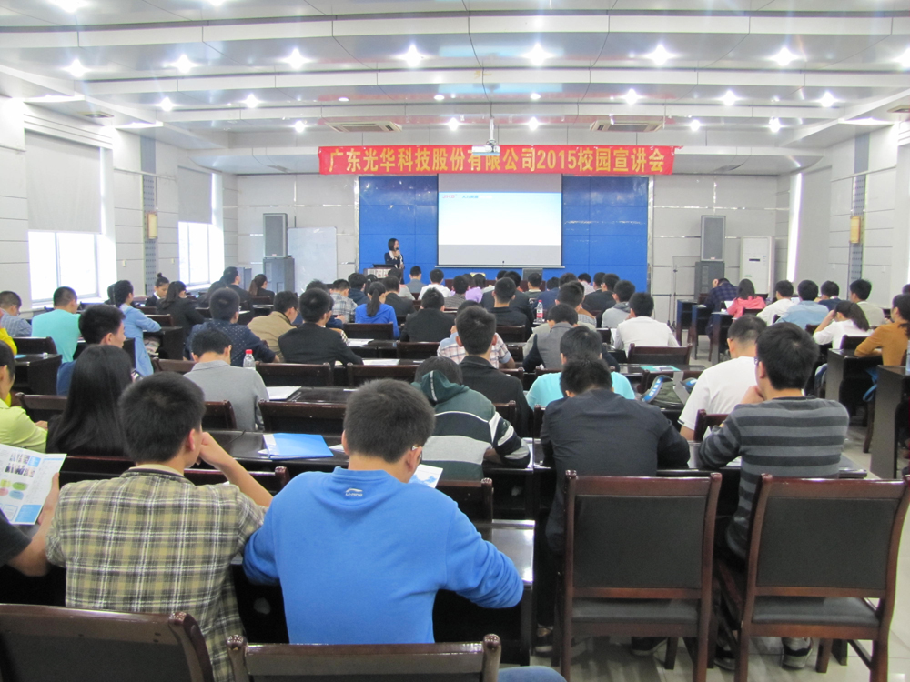 光華科技2015校園招聘會通過校園宣講會、現場招聘會、網絡招聘三種方式予以實施,截止到11月14日,校園宣講會已在中山大學、華南理工大學、暨南大學、湖南大學、中南大學、武漢大學、華中科技大學、四川大學、電子科技大學、上海交通大學、華東理工大學、北京理工大學、北京化工大學及南昌大學等14所國內重點知名高校順利召開。
