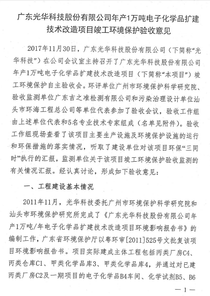 光華科技年產(chǎn)1萬(wàn)噸電子化學(xué)品擴(kuò)建技術(shù)改造項(xiàng)目于2017年11月30日組織了項(xiàng)目竣工環(huán)保自主驗(yàn)收,經(jīng)過(guò)專家組及參會(huì)人員的共同評(píng)審,同意本項(xiàng)目通過(guò)竣工環(huán)保驗(yàn)收,現(xiàn)予以公開(kāi)。