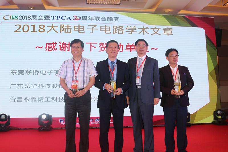 白天的展覽結(jié)束后, CTEX2018展會暨TPCA 20周年聯(lián)合晚宴正式拉開帷幕。TPCA理事長吳永輝先生首先致辭,并為光華科技等贊助商感謝致贈。