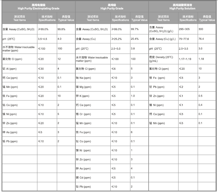 It is the major copper compounds of acid copper plating and electroless copper plating ; it is also the Cu2+ source of plating solution, which is widely used in fields of hardware, plastic, PCB, electronic components and electroless plating etc.