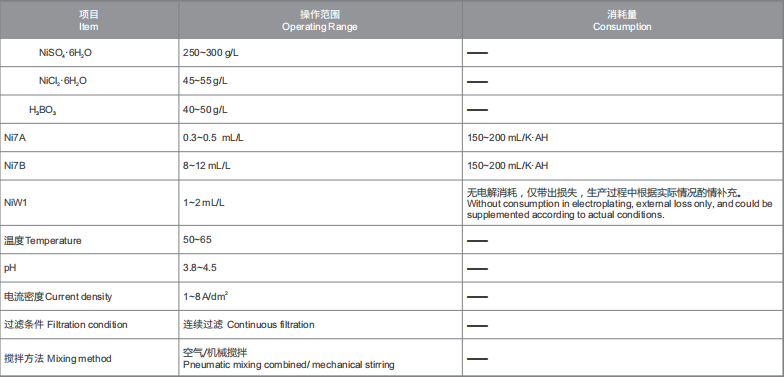 Ni7A:俗稱光亮劑,負責出光和填平。Ni7A不足時,鍍液出光慢,填平能力不足;Ni7A過量時,低電流密度區發暗,嚴重過量時,鍍層脆性大,甚至造成漏鍍;