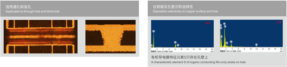 選擇性有機(jī)導(dǎo)電膜(SOC)是在線路板孔壁的樹脂及玻纖上選擇性沉積一層導(dǎo)電性高分子膜。在銅面不成膜,替代傳統(tǒng)的化學(xué)銅,在電路板層間能起導(dǎo)通作用。電鍍時在SOC膜上面快速沉積一層完整的銅面,增強(qiáng)層間互連作用。SOC可用于高多層通孔板、FPC板、HDI板。